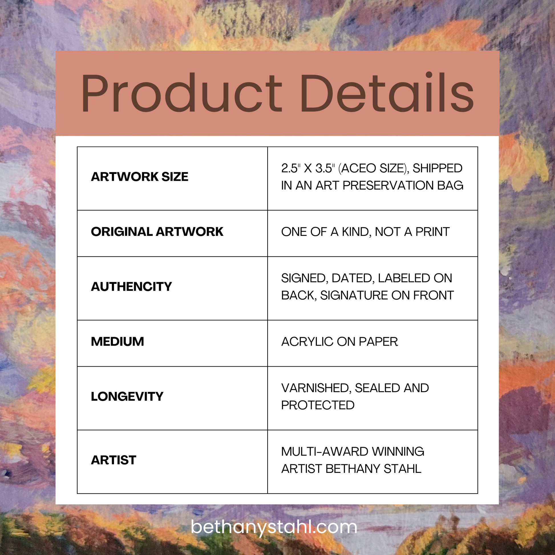 ACEO stands for Art Cards, Editions, and Originals. They are miniature works of art, strictly measuring 2.5 x 3.5 inches (the size of a trading card)