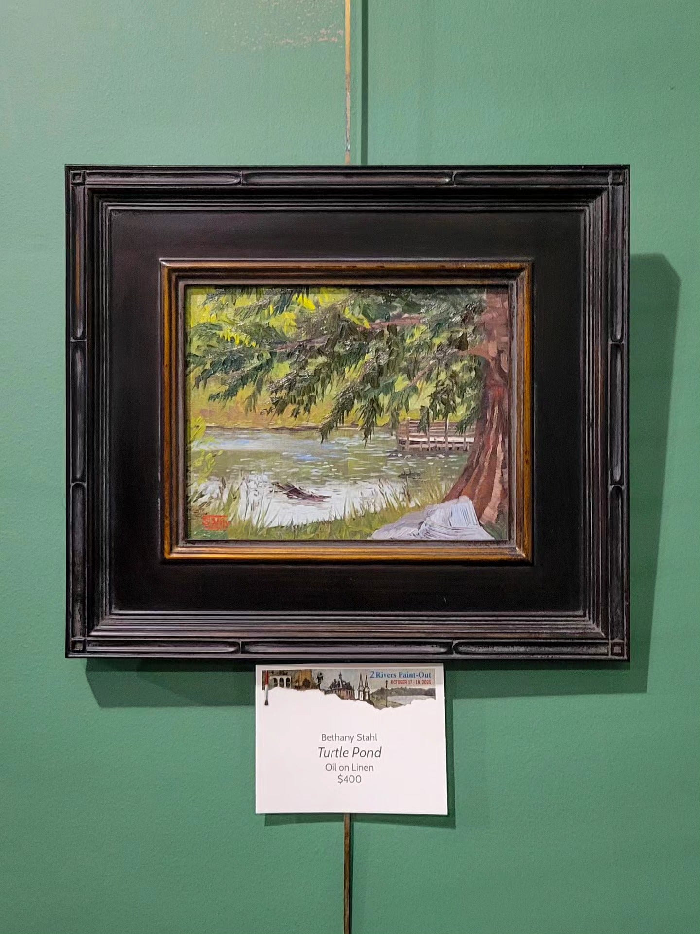 Turtle Pond is an impressionist oil painting that captures sparkling water and turtles on the pond at Liberty Park in Clarksville, Tennessee.